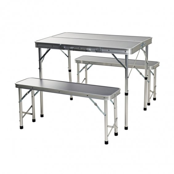Conjunto de mesa con 2 bancos para cámping, resistente al agua mesa en raya gris con borde de 4,5 cm de grosor y patas de aluminio tamaño mesa 90 x 60 x 70 cm, carga máxima 30 kg bancos de 24 x 87 x 40 cm, carga máxima 90 kg las patas del banco y de la mesa ø25 x 0,6 mm de grosor