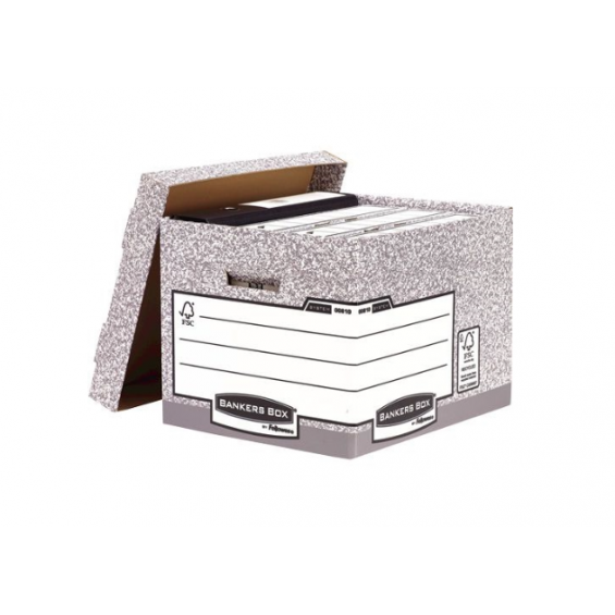 Caja plegable que se ensambla fácil y rápidamente. Cartón 100% reciclado. Se pueden guardar archivadores A4 o folio. La tapa, que es ligeramente más grande, permite guardar carpetas colgantes A4 o Folio. Dimensiones: 333 x 285 x 390 mm.