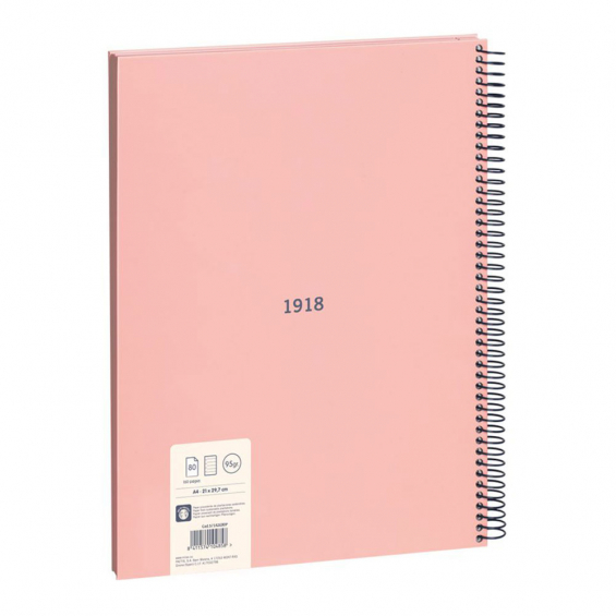 Cuaderno a4 con espiral metálica y tapa dura, color rosa. 80 hojas de papel pautado a líneas (línea simple de 7mm). papel de 95 gr/m² de alta calidad, microperforado y con 4 taladros. iniciador de corte para facilitar la separación de cada hoja. espiral flexible con cierre de seguridad. colección 430 since 1918, fabricadas en españa desde 1918.