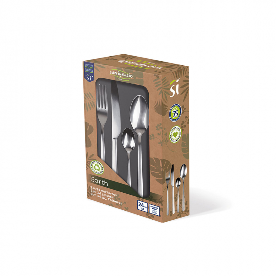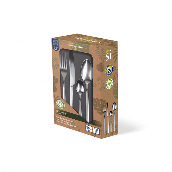 Set 24 unid. cuberteria de acero inox. reciclado brillo earth sg7775 san ignacio. cubertería completa compuesta por 6 cucharillas, 6 cucharas, 6 tenedores y 6 cuchillos de excelente calidad. así se convierte en un set completo, práctico y útil para cualquier hogar. cubiertos de acero inoxidable de altísima calidad lo cuales los hacen ligeros, resistentes y duraderos.
