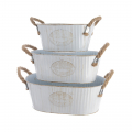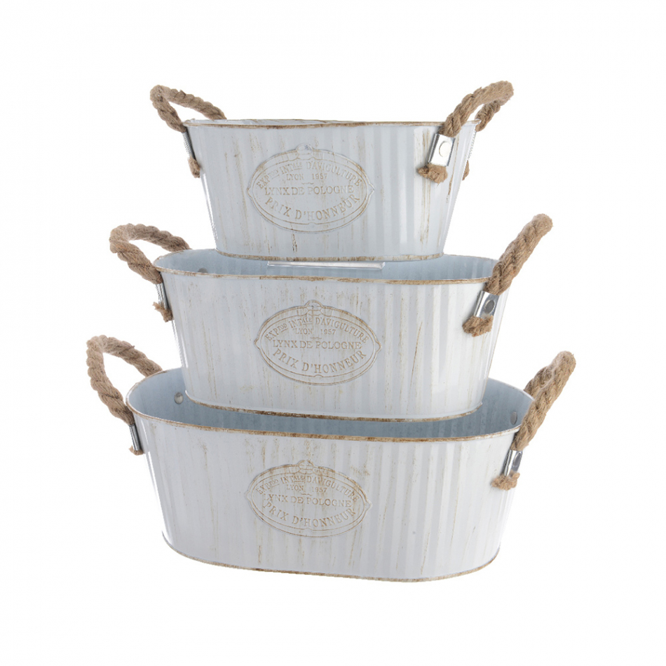 Cubo de zinc ovalado con asa de cuerda set de 3unid. color blanco medidas: 29,5x18,5x11cm/25,5x14,5x10cm/20,5x12x9cm
