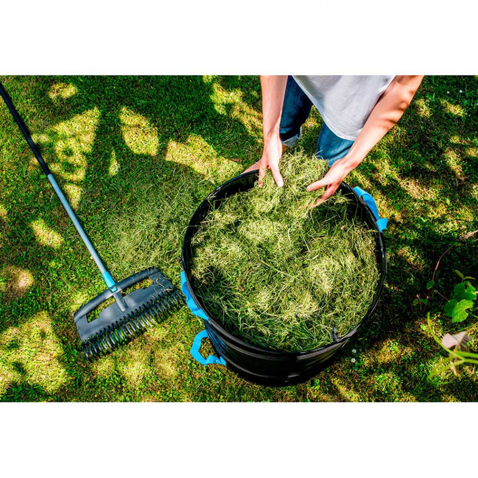 Cubo fabricado en nailon de alta resistencia y espiral de acero. desplegado tiene hasta 172 l de capacidad. muy ligero, impermeable al agua y resistente al desgarro. 56 cm de diámetro y 70 cm de altura desplegado (en sistema de almacenado/plegado tan solo 10 cm de alto). ideal para la recogida de hojas y poda. dispone de asas para el transporte