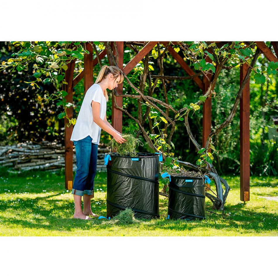 Cubo fabricado en nailon de alta resistencia y espiral de acero. desplegado tiene hasta 56 l de capacidad. muy ligero, impermeable al agua y resistente al desgarro. 40 cm de diámetro y 46 cm de altura desplegado (en sistema de almacenado/plegado tan solo 8 cm de alto). ideal para la recogida de hojas y poda. dispone de asas para el transporte