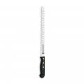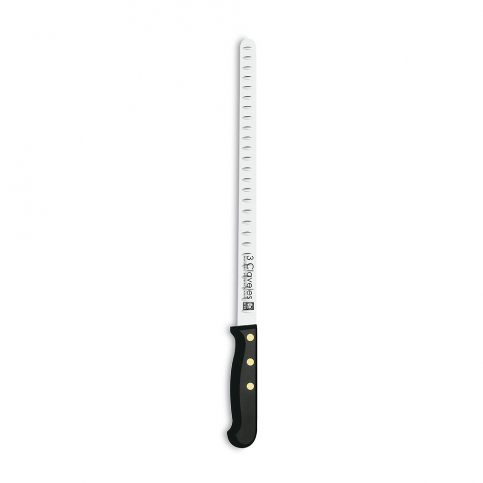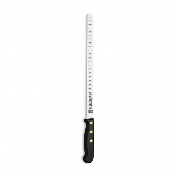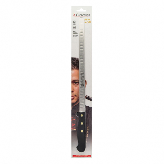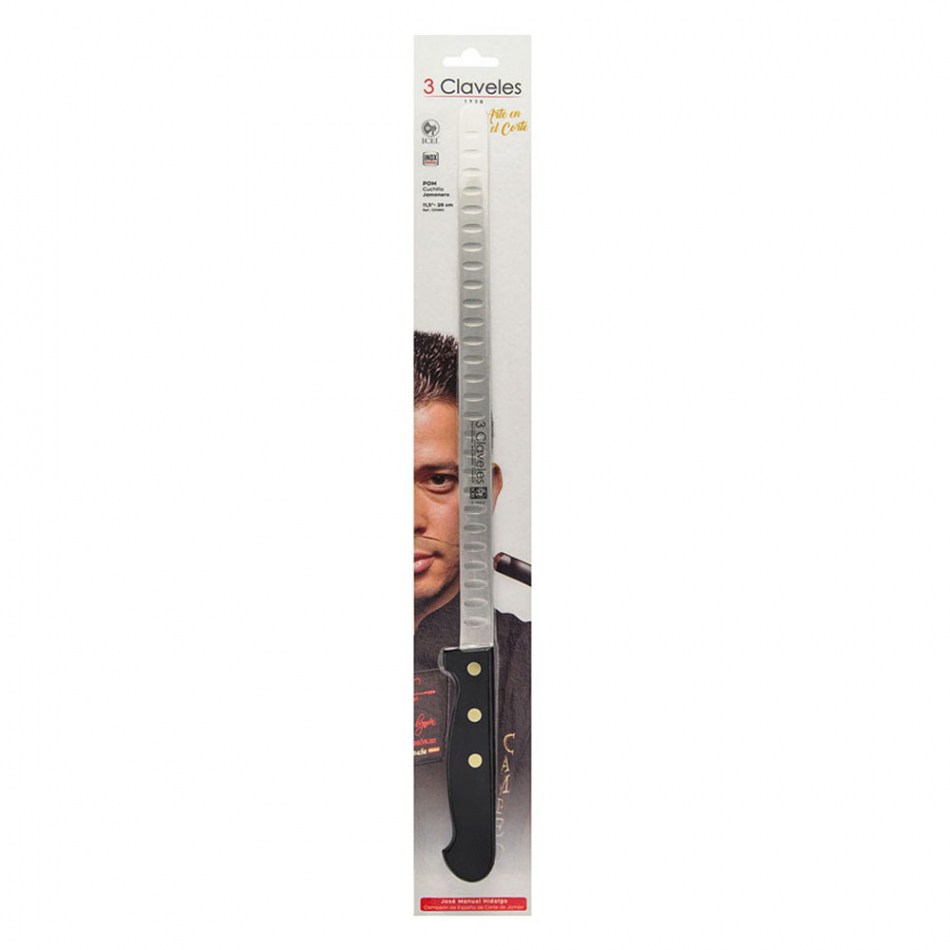 Cuchillo jamonero 28 cm de hoja alveolada y flexible, que permite conseguir lonchas finas para una mejor degustación y aprovechamiento del jamon. la hoja alveolada permite que la loncha no se quede adherida al cuchillo. fabricado en acero inox y con mango pom. profesionales del corte como jose manuel hidalgo , campeon de españa de corte de jamon 2014 , consiguió el galardon utilizando este cuchillo. presentado en display/colgador