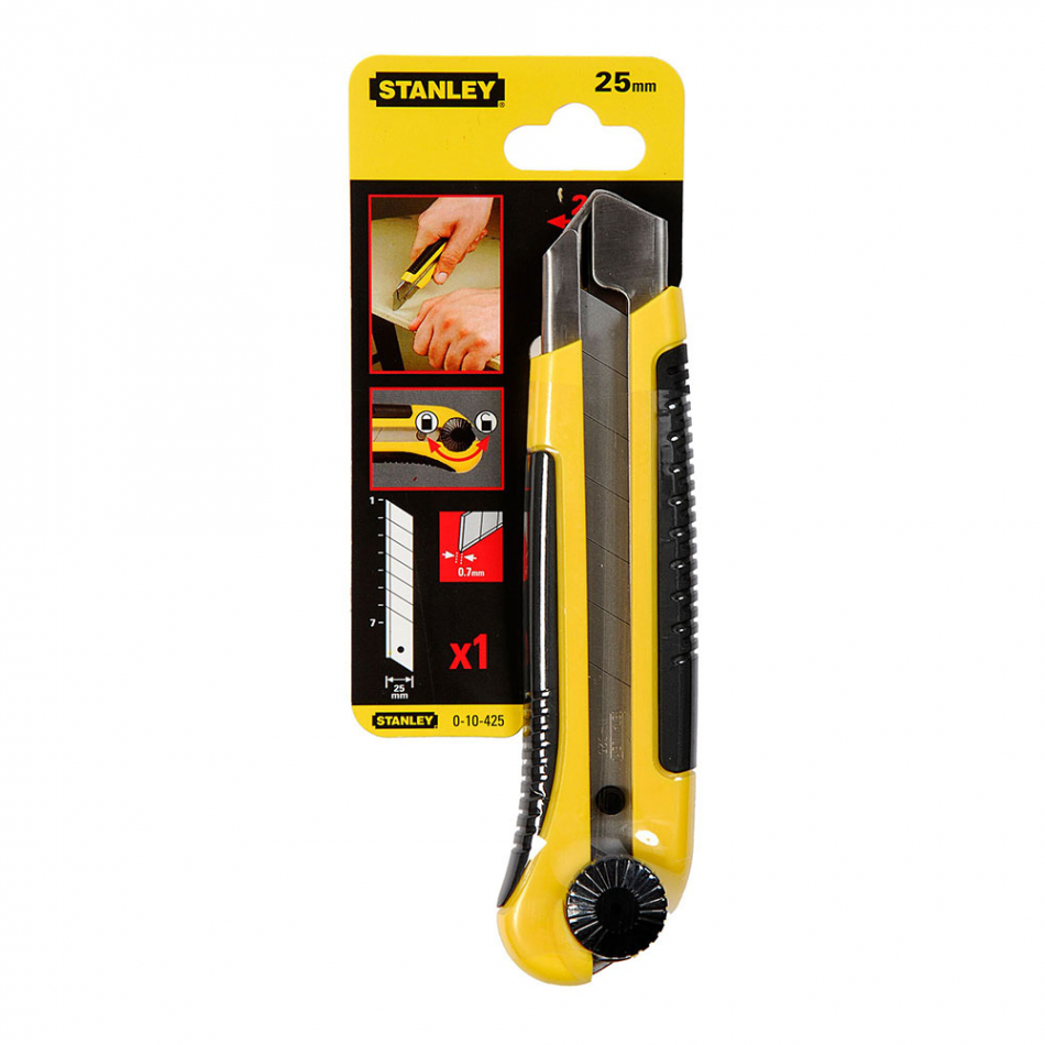 Cúter 25mm. cúter con cartucho de acero inoxidable. sistema de bloqueo de la hoja mediante rueda. mango bimateria. hoja seccionable en 7 cortes. hoja de 25mm y 0,7mm de grosor que mejora el rendimiento durante los trabajos más exigentesideal para los plásticos que se utilizan en la industria de embalaje, para cortar materiales finos, en particular recubrimientos de suelos, tejados y plásticos. soporte y guía de la hoja en acero inoxidable para prolongar su vida útil y la solidez del cuchillo retráctil. las hojas son adecuadas para todos los cuchillos stanley