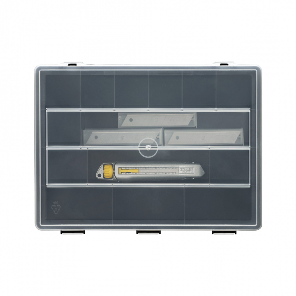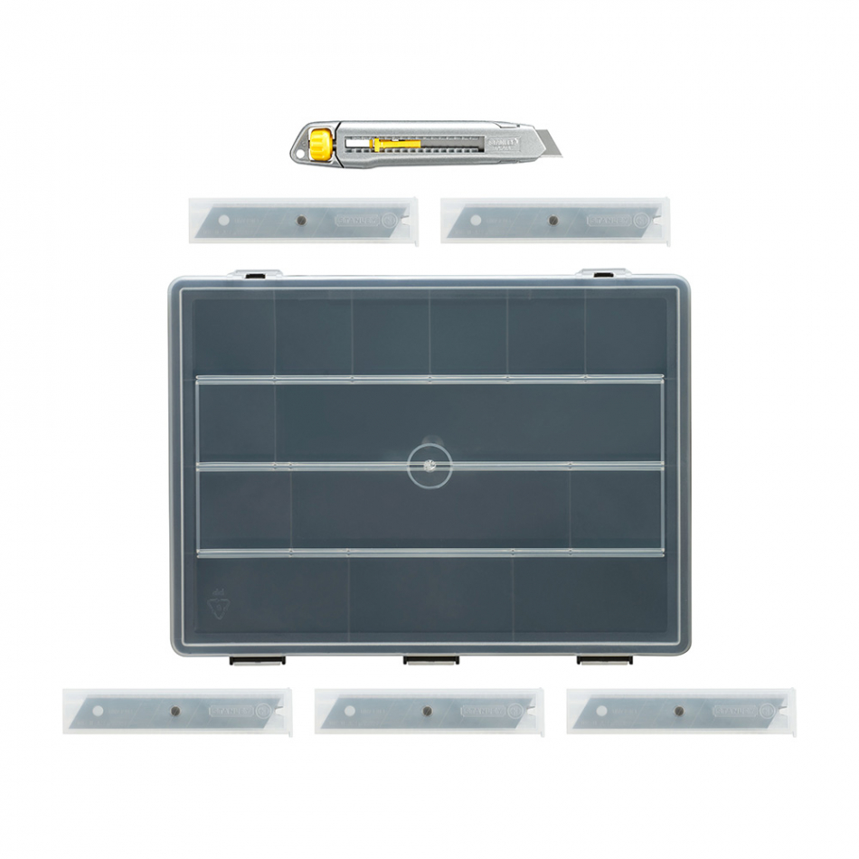 Pack interlock® cutter metálico retráctil 18 mm + 50 cuchillas + organizador con 14 compartimentos y asa para su transporte, dimensiones 33,5 x 5,6 x 25,5 cm