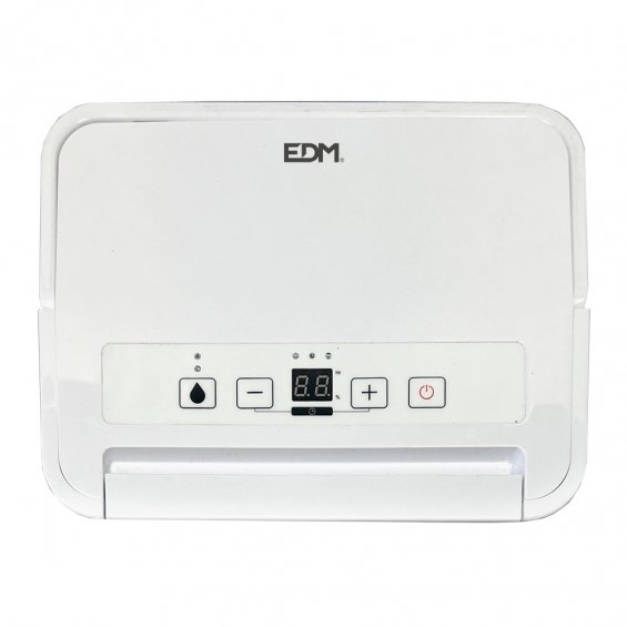 Deshumidificador blanco 250w,1,45 a, 12l día a 30°c y humedad relativa de 80% / 6l día (27ºc - 60%). depósito 2,1l. 42db. volumen de aire por hora: 100m³. adecuado para un area de 15- 20m². carga de refrigerante r290/40g. peso 9 kg. 27 x 20,5 x 50 cm. incluye ruedas. edm