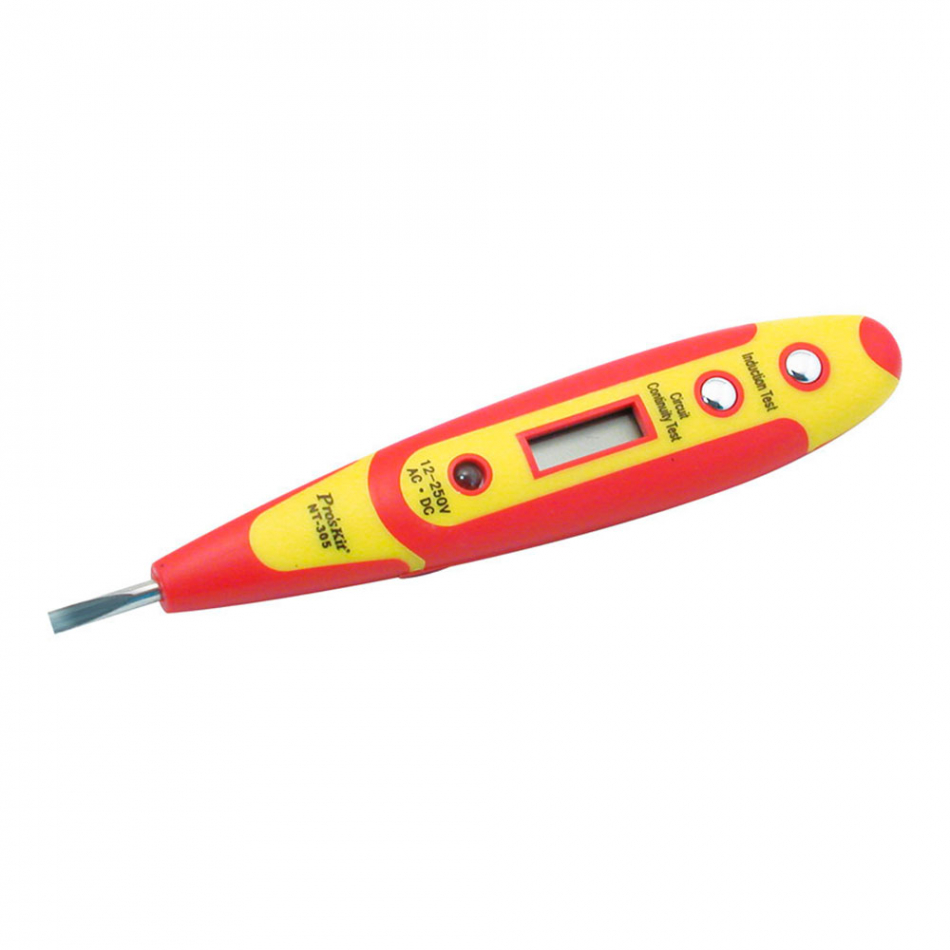 Destornillador/detector de tesión y continuidad proskit. pantalla y led azul que hace posible la lectura de la pantalla incluso en zonas oscuras. función de autodetección para comprobar baterías. práctico tamaño tipo lápiz para una rápida y fácil comprobación de voltaje vcc/vca. test de voltaje vca de 70v a 250v ca, vcc de 12v a 50v cc.