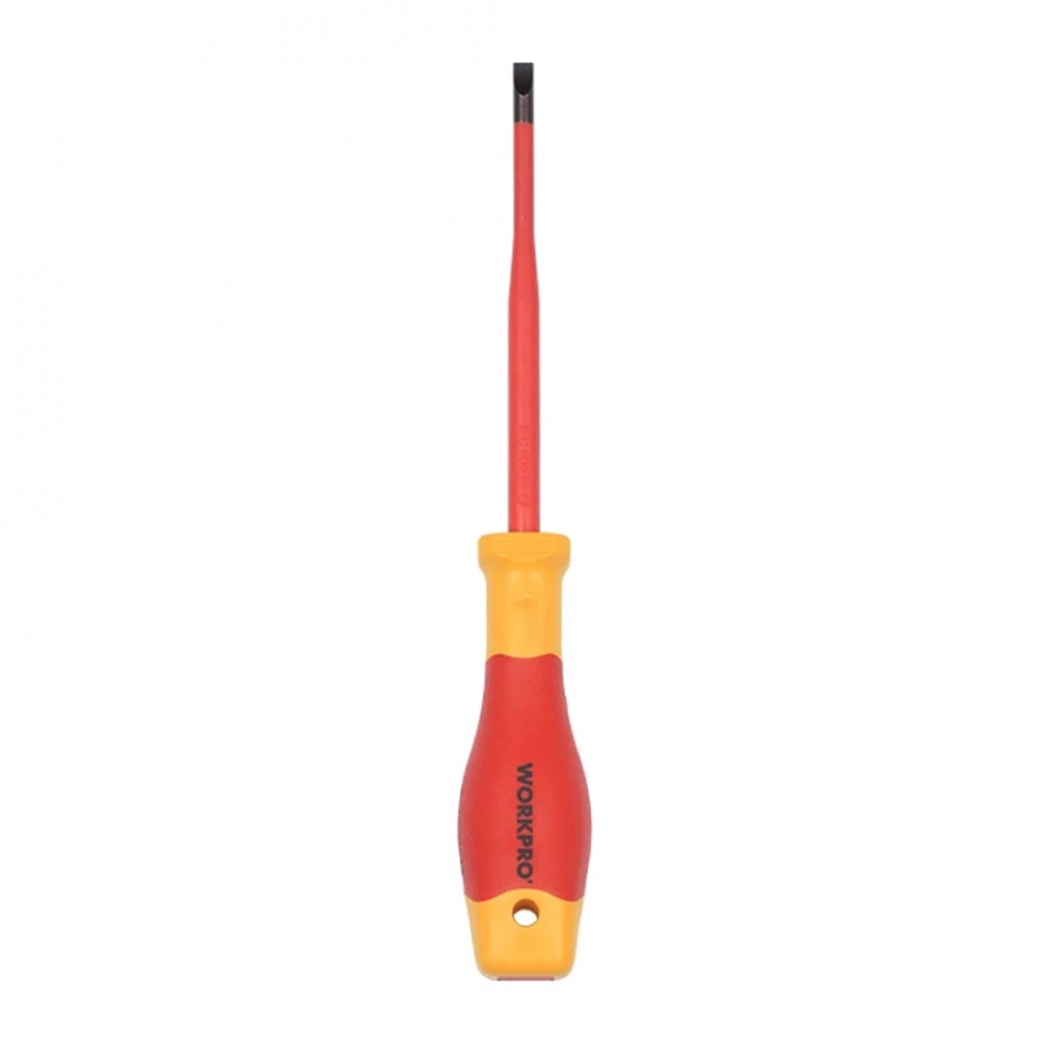 Destornillador plano aislado vde 0,8 x 4 x 100mm. aprobado para 1. 000 v ac fabricado según en/iec 60900, cada herramienta se prueba individualmente a 10 000 v ca el diseño ergonomico de los componentes del mango permite un trabajo preciso y sin fatiga. la hoja delgada con aislamiento completo garantiza un fácil acceso a los tornillos profundos. cuerpo de acero s2 al cromo vanadio molibdeno, color rojo y amarillo. workpro