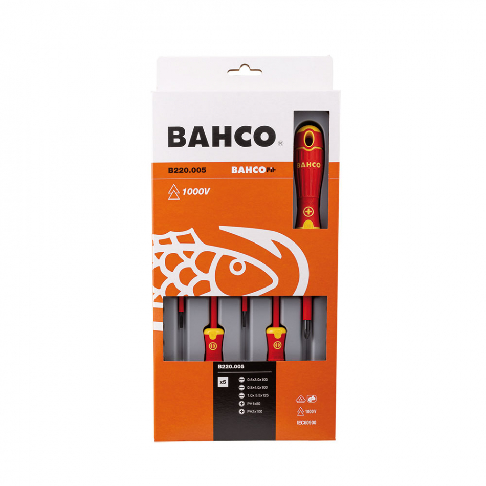 Juego de destornilladores ranurados y phillips aislados vde bahcofit con mango multicomponente, (planos 3 x 100 4 x 100 5.5 x 125 phillips ph1 x 80 ph2 x 100)