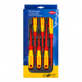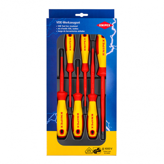 Juego de destornilladores vde 6 piezas knipex. tornillo plano/phillips. 1x98 20 30 destornillador tornillo plano 3,0mm ,1x98 20 40 sl destornillador (slim) tornillo plano 4,0mm, 1x98 20 55 sl destornillador (slim) tornillo plano 5,5mm ,1x98 20 65 sl ,destornillador (slim) tornillo plano 6,5mm1x98 24 01 sl destornillador (slim) para tornillos cruciformes phillips® ph1, 1x98 24 02 sl destornillador (slim) para tornillos cruciformes phillips® ph2. no contiene svhc. dimensiones: 171x37mm. peso: 550g.