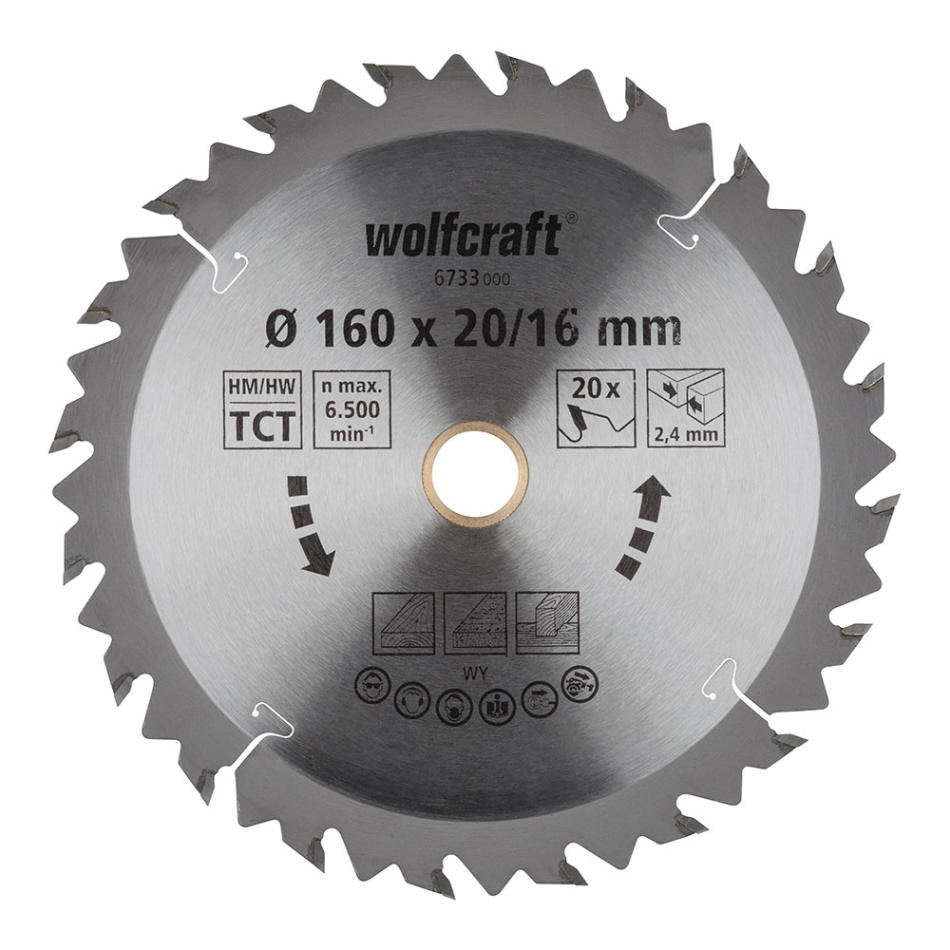 Disco de sierra circular de mano cv, serie marrón cortes rápidos y bastos diámetro de trabajo: ø160mm alojamiento del agujero: 20mm ancho de corte: 2.4mm número de filos: 20 velocidad máx. de rotación: 7.000 rpm disco de sierra ct con dentado alternado y bajo número de dientes para cortes longitudinales y transversales rápidos y bastos en madera y tablero de virutas larga duración dimensiones: ø160mm peso: 0,275kg 6733000 wolfcraft