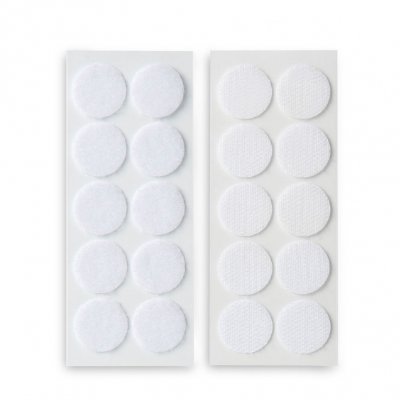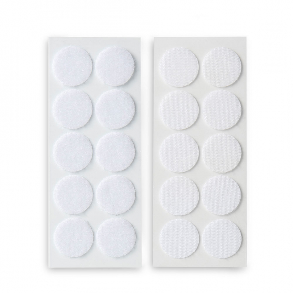 Discos adhesivos de cierre de gancho y bucle ø20mm. blanco, 2146-2, discos de ø 20 mm. fijación adhesiva. excelente resistencia a la intemperie y ambientes de alta temperatura hasta 80 ºc (incluso apto en interiores de vehículos). fuerte adhesión inicial, puede adaptarse a diversas superficies de sustrato (plástico, metal, vidrio, madera y otras superficies de baja energía superficial). reutilizable hasta 15 000 veces. sujeción rápida y segura. ausencia de componentes volátiles nocivos. composición: 60 % nylon, 40 % poliéster., inofix