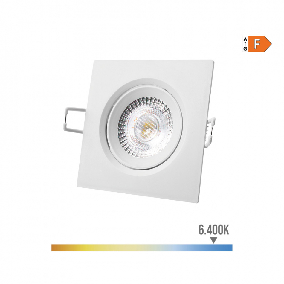 Downlight led empotrable cuadrado 5w 6400k luz fria. color blanco. clase energetica f. 380lm ip20. angulo apertura: 120° medidas: exterior: 9x9cm - enclavamiento: ø7cm 220-240v. 25000h edm