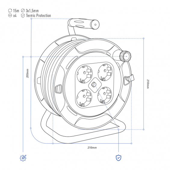Enrollacables profesional con protector termico manguera 3 x1,5mm 15m 4 tomas t/tl ø21x27cm ip20 230 v 16 a