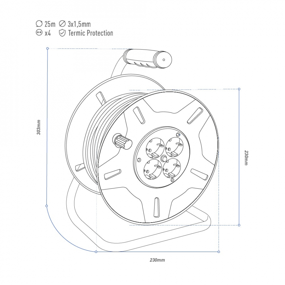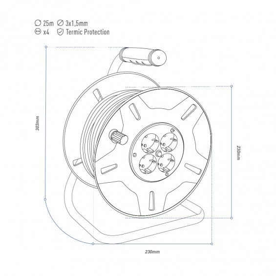 Enrollacables con protector térmico 3x1,5mm 25m 4 tomas ip20 h 0,5v. tensión: 230 v. intensidad: 16 a