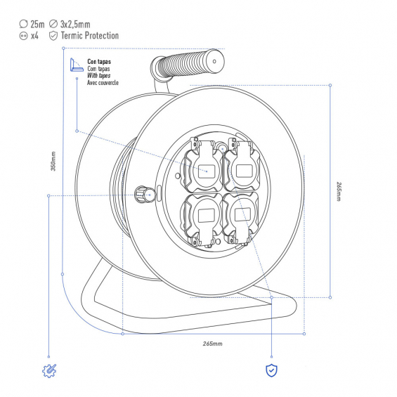 Enrollacables profesional con protector termico ø3x2,5mm 25m 4 tomas con tapa 3000w 230 v 16 a ip20 h 0,5v ø 26 x 34 cm