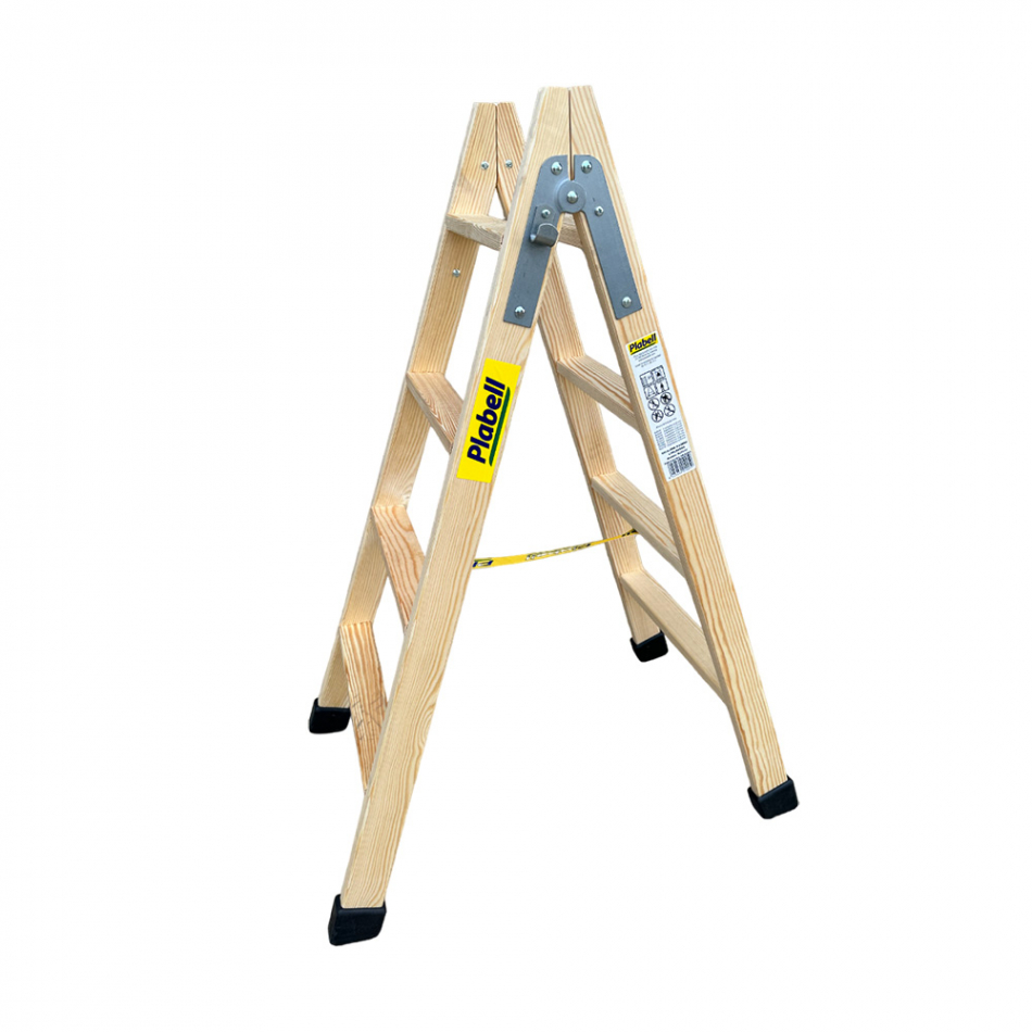 Escalera de madera 4 peldaños 114cm plabell bld-4. especial para pintores y electricistas, de uso exclusivo en tijera y de doble subida. con peldaños anchos, de 6cm, y montantes de sección piramidal sobre su anchura total, alargada progresivamente de arriba hacia la base. en la parte superior, además del sistema anti apertura, los peldaños conforman un tipo de estructura para acoger todo tipo de materiales y recipientes. para asegurarse de la estabiliad de la escalera, se quipa también con tacos de goma antideslizantes y cinta antiapertura. medidas: 114x31/48cm. nº peldaños: 4+4. peso escalera: 4kg. garantía 2 años. normativa eu en 131-1-2.
