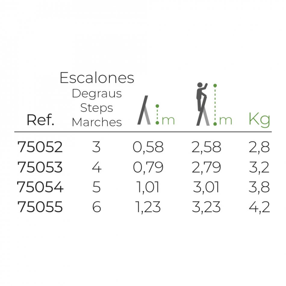 Escalera doméstica de aluminio 4 peldaños. medidas plegada: 43 x 10,5 x 149 cm. altura del último peldaño 79 cm. peso de la escalera: 3,2 kg. peso máximo: 150 kg
