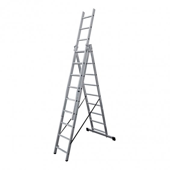 Escalera transformable de aluminio 3 x 9 peldaños. medidas plegadas: 49 x 19 x 255 cm. altura del último paso 5,80 m. peso de la escalera: 13,4 kg. peso máximo: 150 kg. 6,04 m de longitud máxima en uso, sistema de bloqueo de seguridad, guias de deslizamiento en aluminio, base estabilizadora y cinta de seguridad de nylon. en131