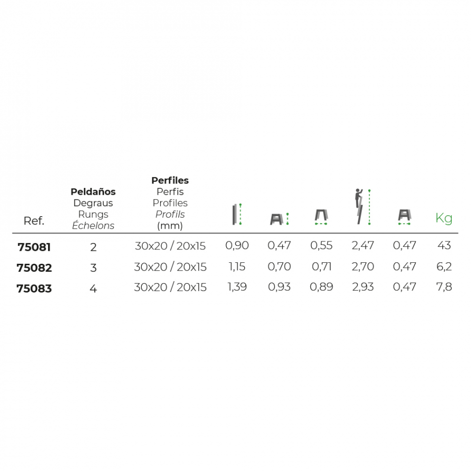 Escalerilla de acero 2 peldaños con plataforma de acero con alfombrilla antideslizante de 30x20cm, sistema de seguridad antiapertura, conteras de pe con relieves antideslizantes. dimensiones: 47x55x82cm altura del último peldaño 47cm longitud máx en uso 2,47 cm en14183