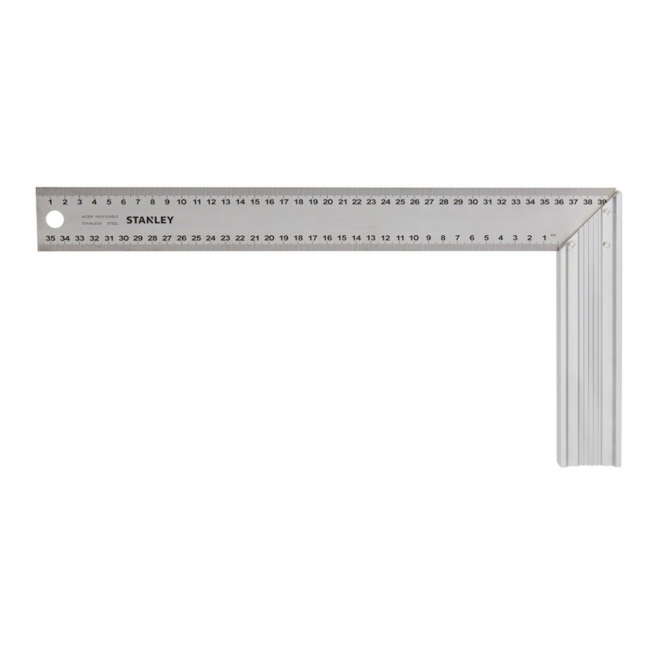 Escuadra de carpintero 200x400mm. escuadra angular (45°). talón de perfil de aluminio. lámina de acero inoxidable grabada (procedimiento gravemat) graduación en mm en ambos lados. stock biselado para que establezca tanto el 90° y 45° ángulos. aluminio extruido que está triplemente remachado a la hoja para conseguir fuerza y precisión. foto de alta visibilidad grabado hoja de acero inoxidable graduada grabada con hueco profundo (procedimiento gravemat) stanley