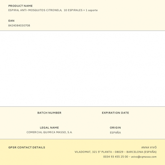 Espiral anti-mosquitos de citronela con 30 m3 de cobertura. 1 espiral dura más de 8 horas, combustión paulatina y constante. fragancia de inspiración natural. para uso en interior y exterior