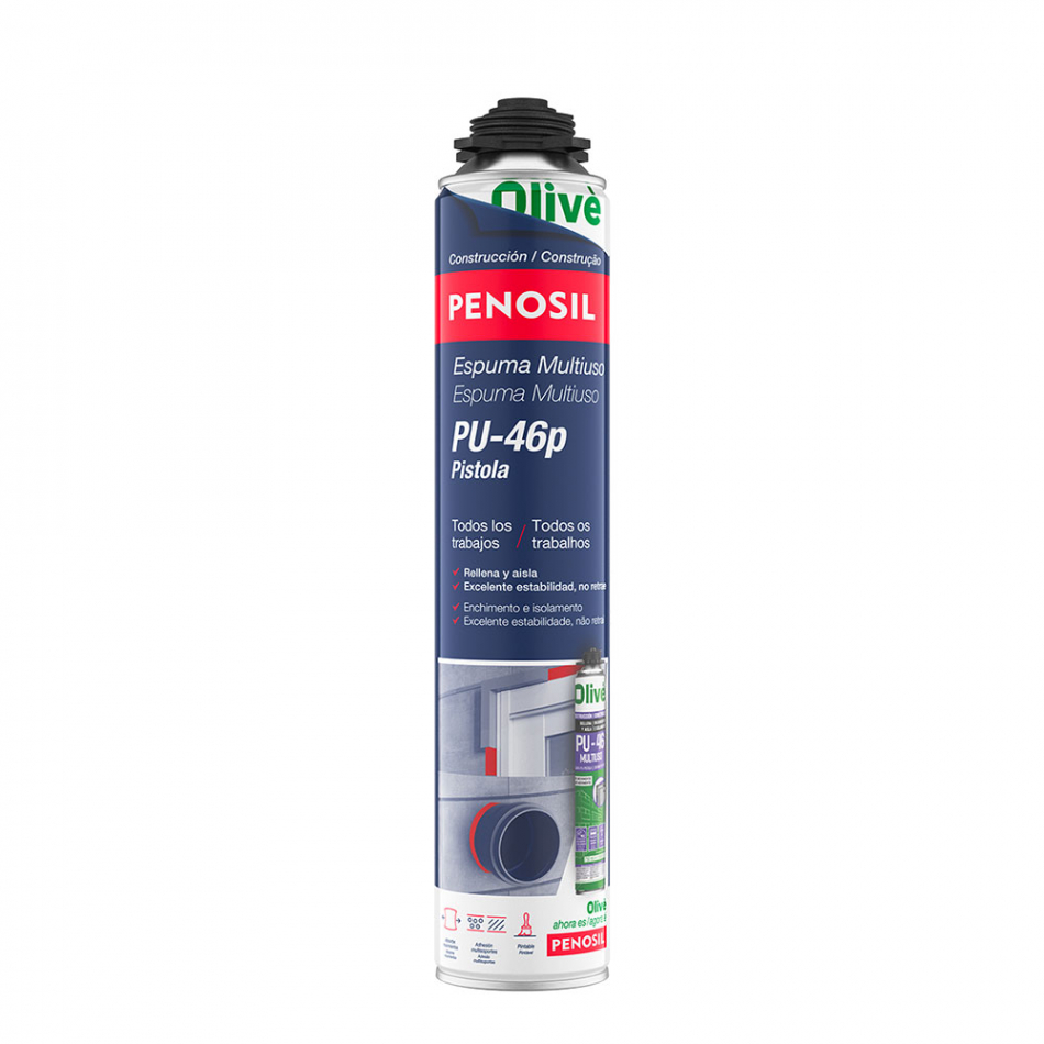 Espuma de poliuretano multiuso pu-46, monocomponente y auto expandible de aplicación con pistola, 750 ml. absorbe movimientos, adhesión multimateriales, pintable, incluye guantes desechables