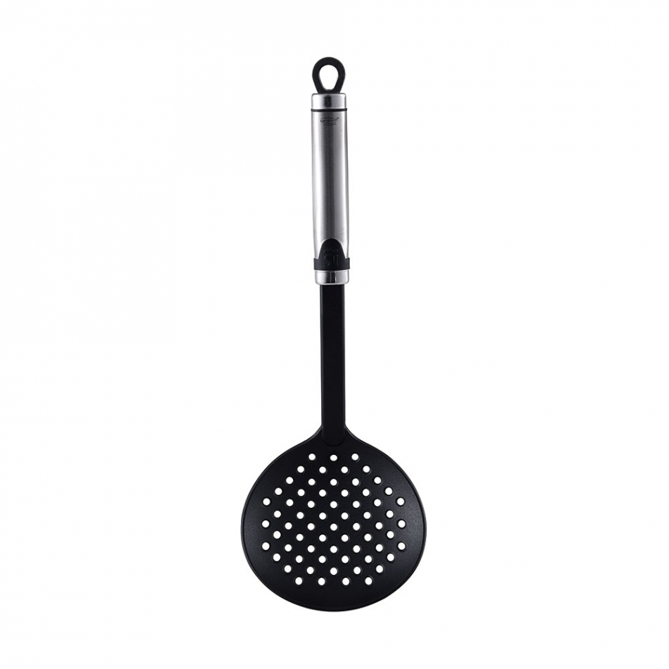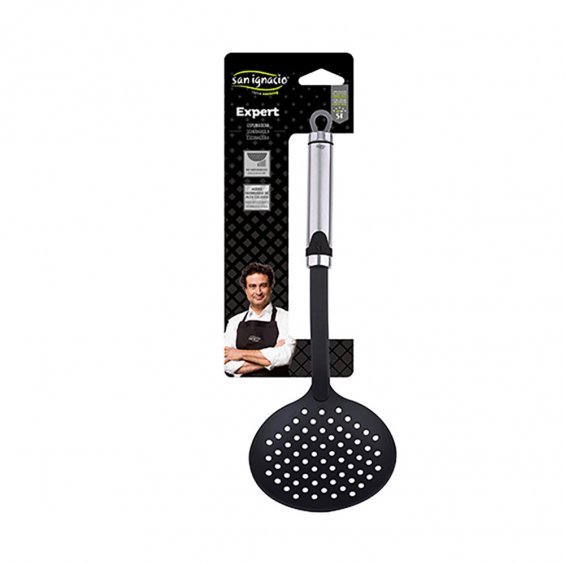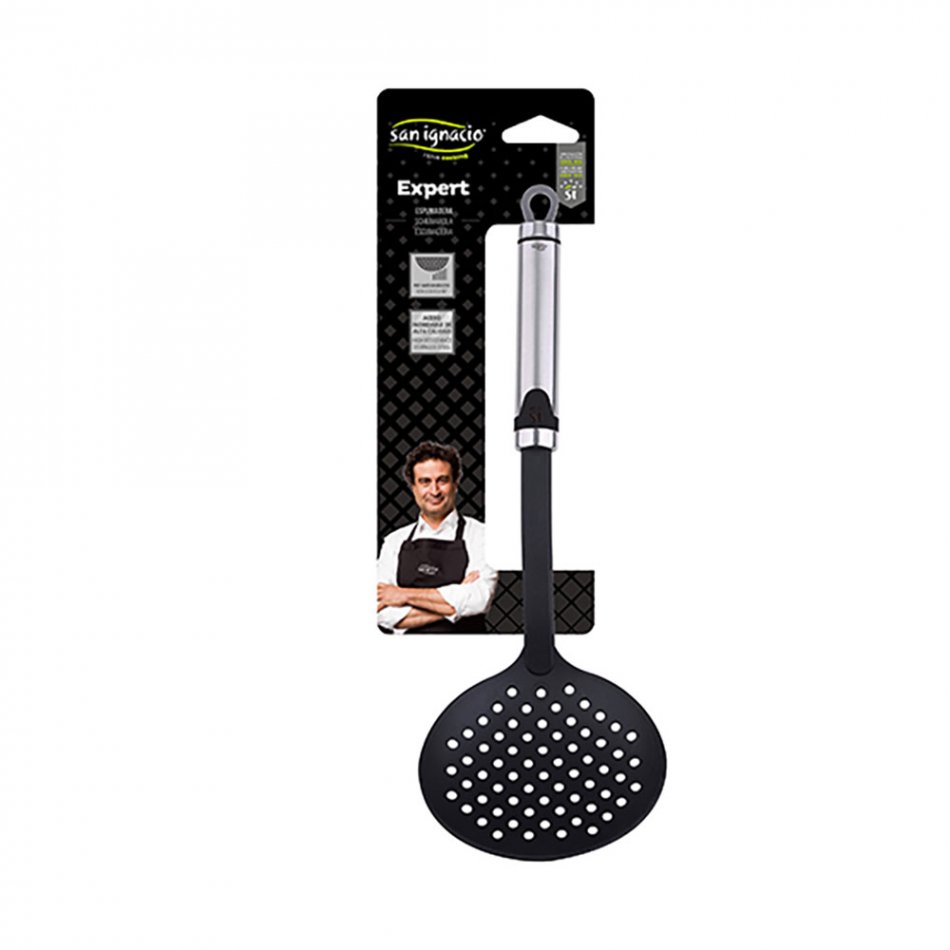 Espumadera 35.5x11.5cm expert sg7332 san ignacio. espumadera de cocina profesional. está fabricada con un acabado ideal para cocinas profesionales o aficionados a la cocina. es muy fácil de manipular y ofrece un acabado elegante, resistente y práctico. máxima comodidad. sus precisas medidas de 35.5x11.5cm hacen que esta espumadera sea más práctico que una paleta de cocina. servirá para espumar bebidas aun en envases profundos. fabricación de nylon pbt. no es una espumadera silicona, sino que su herramienta está hecha de nylon negro que no araña ni raya otras superficies, sin importar si el material es delicado. diseño elegante y resistente. su asa está hecha con acero inoxidable pulido de alta calidad que lo hace más resistente. tiene inserciones negras para complementar el estilo y diseño elegante. fácil de guardar. la espumadera incorpora un anillo para colgar al final de su asa, por lo que su diseño hace que resulte cómodo. este producto también resulta fácil de limpiar.