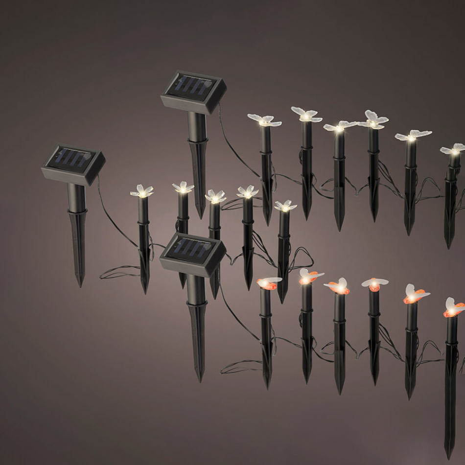 Luz de estaca solar modelos surtidos 898168 luz de estaca solar modelos surtidos con formas de flor, mariposa, abeja con luz led fija y multiple salida. panel solar policristalino y interruptor. 2v 2lm altura 17cm longitud 120cm