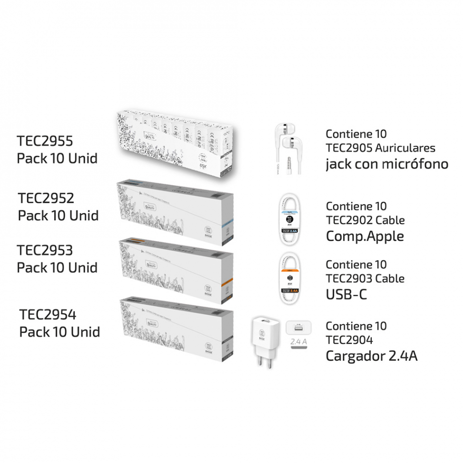 Expositor cargadores, cables y auriculares tech one tech serie bsk compuesto por: 10 x auriculares con micrófono blanco jack 1,2 m, 10 x cables basik lightning 2,4 a blanco, 10 x cables basik usb-c 2,4 a blanco, 10 x cargadores basik 2,4 a blanco (usb-a). gratis: 1 x caja-expositor troquelada y decorada y 3 x auriculares con micrófono blanco jack 1,2 m.