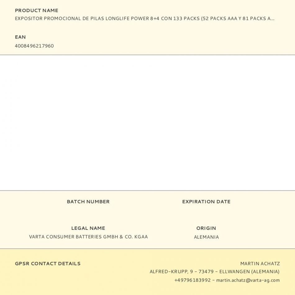 Fabricante:   Varta    P/N:      EAN:  4008496217960    Código:  376646