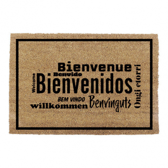 Felpudo 60x40cm modelo bienvenidos en distintos idiomas, 100% fibra de coco, parte posterior: respaldo de vinilo de pvc, grosor 1,5cm