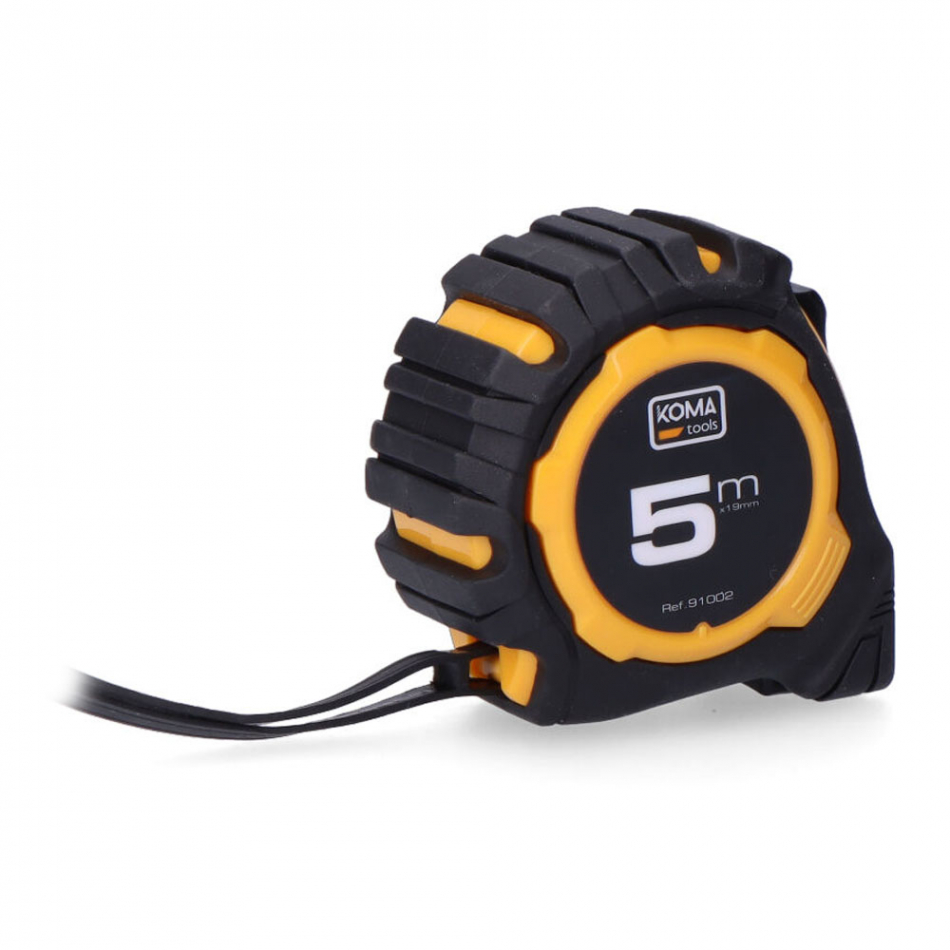 Flexómetro 5m x 19mm abs standard koma tools. cuerpo fabricado en abs antideslizante. dos posiciones de bloqueo, clip para cinturón. grosor de la cinta 0,105mm, cinta numeración amarilla acabado mate.