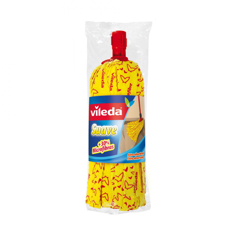 Fregona suave + 30% microfibras. fregona de tiras amarillas de gran absorcion. el material incorpora un 30% de microfibras que incrementa la absorcion y capacidad de limpieza de la fregona. apta para superficies delicadas. cabezal limpia-rincones, exclusivo de vileda. anclaje universal para usarse tanto con palos vileda como con otros palos de rosca