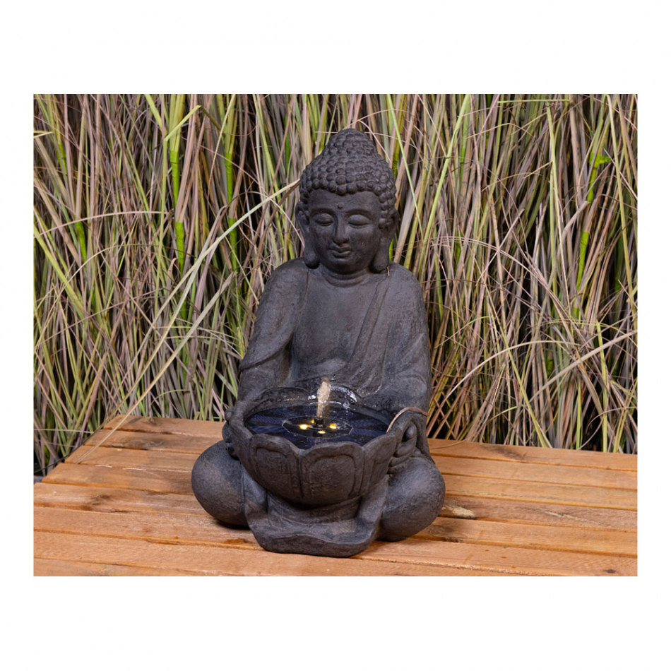 Fuente buda solar. luz cálida 4 leds. dimensiones: 29,5x28x45cm (ancho/fondo/alto) ip68. función apagado automático. caudal de agua ajustable. función día y noche hasta 4 horas después del anochecer. con apariencia y estilo de piedra.