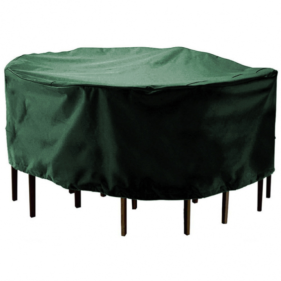 Funda de protección. cubre mesa y sillas ø325x90cm (diámetro/alto). material poliéster 240g/m² impermeable. forma circular. incopora bolsillos transpirables en los laterales. ojales que facilitan su atado y/o sujeción. incluye cuerda de sujeción.