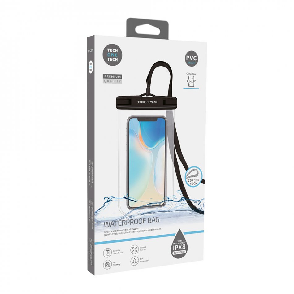 Funda de agua impermeable con capacidad para móviles de hasta 7" y/o otros objetos personales. con protección ipx8 (sumergible hasta 30m) y lanyard para colgar del cuello de 40cm. fabricado en pvc. soporta face id, sensible al uso táctil y no adecuada para el desbloqueo del smartphone por huella.