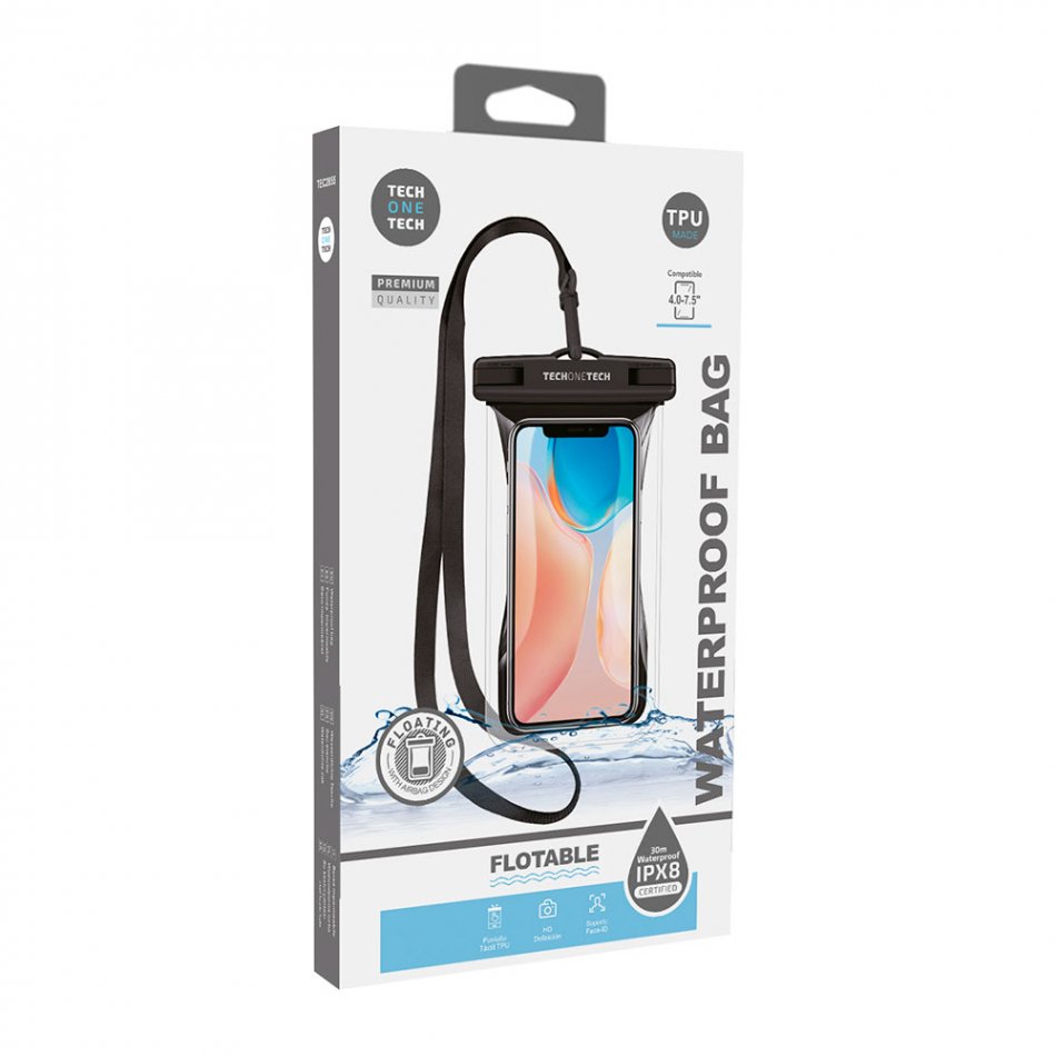 Funda de agua impermeable con capacidad para móviles de hasta 7,5" y/o otros objetos personales. con protección ipx8 (sumergible hasta 30m) y cordón para colgar del cuello de 40cm. soporta face id, sensible al uso táctil y no adecuada para el desbloqueo del smartphone por huella. flota en la superficie, para evitar perder tu móvil en el agua. fabricada en tpu que tiene una buena resistencia al agua y a los rayos uv, lo que lo hace adecuado para su uso en ambientes de agua, piscina, playa y exteriores.