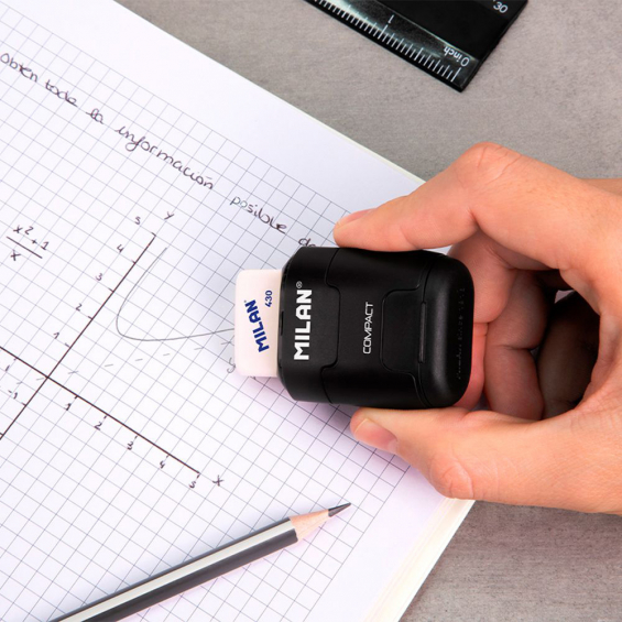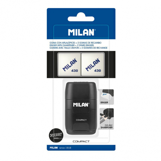 Combinación de goma de borrar y sacapuntas doble (estándar y maxi) con depósito. diseño compact serie especial shadow, color negro. goma cuadrada de caucho sintético tipo 'miga de pan'. el sacapuntas dispone de una cuchilla de acero afilada y resistente, ideal para todo tipo de lápices. sacapuntas con cuchilla de seguridad: este sistema evita que se pueda separar la hoja del cuerpo del sacapuntas. diseño original creado por el departamento de i+d de milan. incluye 2 gomas de borrar de recambio (modelo 430). las gomas de borrar milan están fabricadas en españa desde 1918.