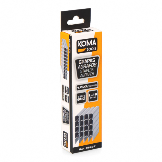 Grapas multiusos tipo 600 longitud 19 mm 1000 unidades, compatible con grapadora clavadora koma tools 08436. medidas: 5,7 x 1,25 x 19 mm