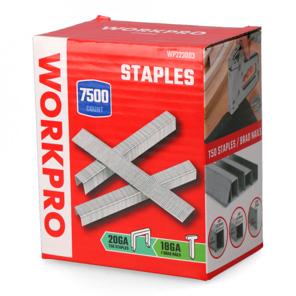 Grapas variadas, 20ga t50 10 mm, 12mm + clavos 18ga f 15 mm, 7500 uds