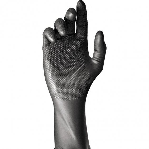 Caja 50 guantes desechables de nitrilo, negro sin polvo talla 8, ambidiextro. grosor 0,15 mm. usos: montajes, pintura en spray, industría química (riesgos mínimos), mantenimiento de vehículos, servicios de limpieza, agricultura, horticultura, talleres, uso general