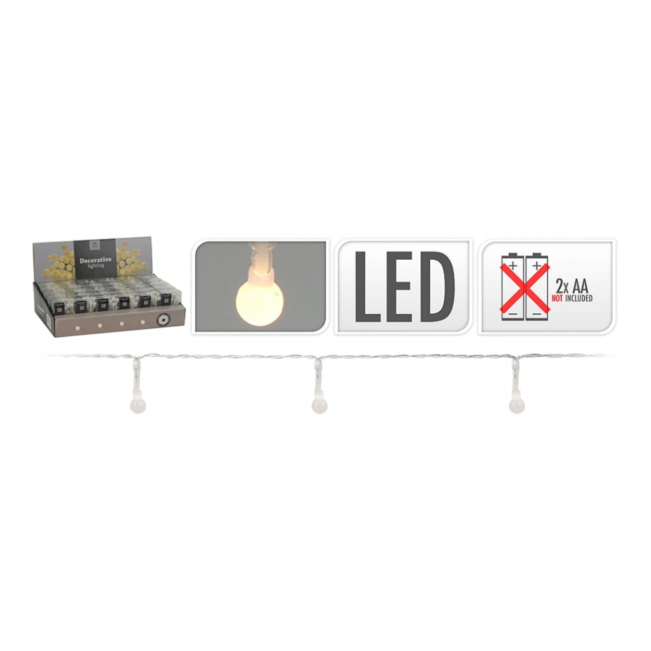 Guirnalda a pilas fija 20 leds esferica 8mm luz blanco calido pilas 2xaa no incluidas ip20 cable transparente 10cm entre bombillas led cable alimentación 30cm. distancia entre la primera bombilla y la ultima 2m. largo total: 2,3m