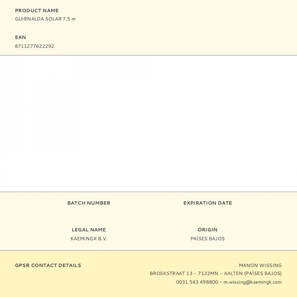 guirnalda exterior solar incluye: 1 bateria 1xaa 200 mah. panel a primera bombilla 3m distancia entre bombillas 50cm de la primera a la ultima bombilla : 4,5m lumens: 1 - panel solar policristalino bombillas no reemplazables 7,5m