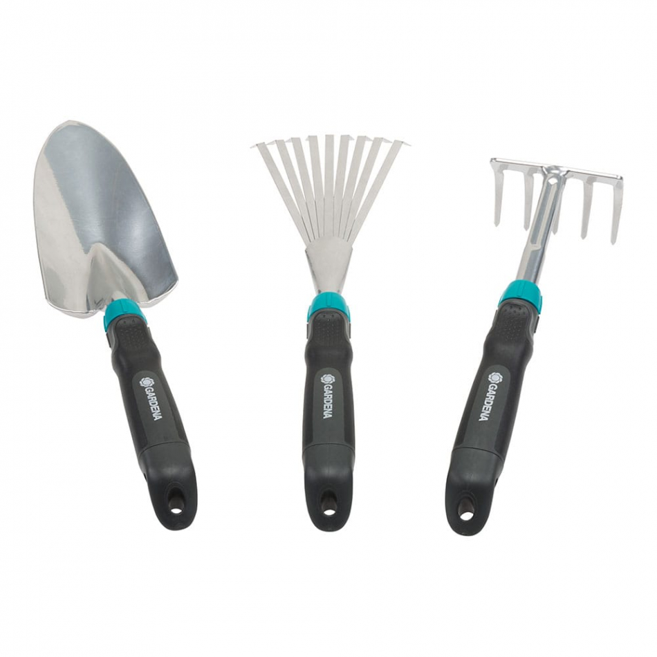 Herramientas comfort. material acero con mango ergonómico. incluye 1 pala transplantadora, rastrillo de mano y rastrillo de césped