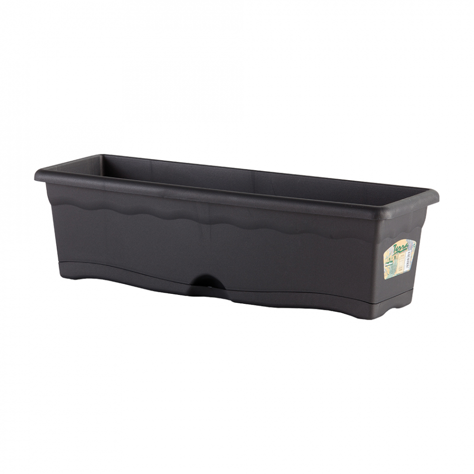Jardinera con plato integrado color antracita 50x20cm. (ancho/fondo) pensada para uso en exteriores por su alta resistencia a los rayos solares, su robustez y su textura