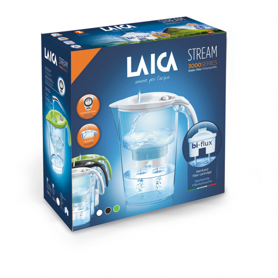 Jarra stream verde con capacidad total de 2,3 l y capacidad de agua filtrada de 1,20 l. incluye 2 filtros bi-flux. cada filtro equivale a 1 mes de agua filtrada o 150 l. flujo de llenado a través de la tapa superior, con indicador manual de la vida del flitro. filtro a base de carbones activos para mejorar el sabor del agua y mantener las sales minerales útiles para el cuerpo. 272 x 93 x 265 mm