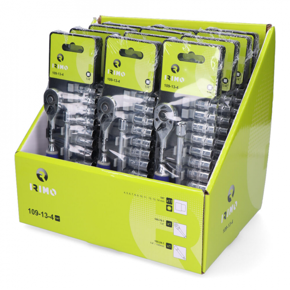 Juego de carraca 1/4", vasos y alargador, 13 piezas 109-13-4. juego de vasos de 1/4" en expositor. juego de 11vasos+carraca+alargador. vasos hexagonales en dimensiones métricas. acabado cromado brillante. el expositor incluye 12juegos. din 3120, din 3124 y din 3122."