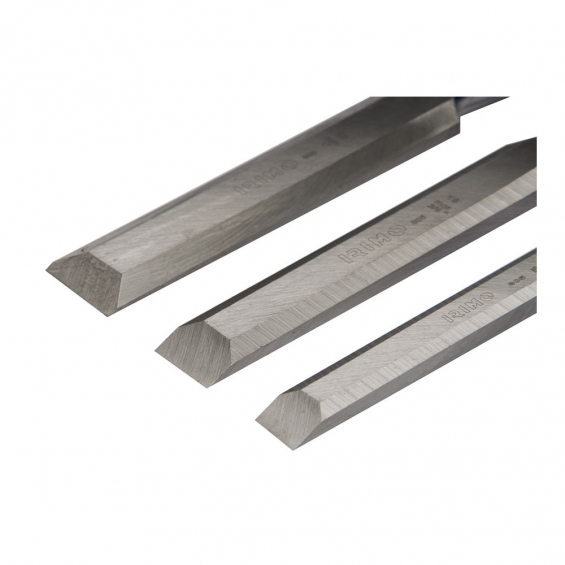Juego de 3 formones (12,18,25mm) 805-3-c. el juego incluye cinceles de 12, 18 y 25mm. diseñado para su uso con una maza de madera o la palma de la mano. cómodo mango de polipropileno monocomponente. hoja con rectificado de precisión para un filo máximo. acero templado y endurecido de alta calidad para un rendimiento duradero. juego de 3piezas con protector de puntas en una caja de cartón. normas: iso2729.
